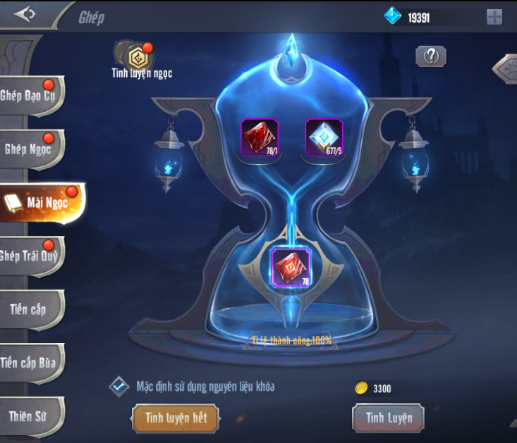 - Tinh luyện ngọc cần có đạo cụ Đá tinh luyện và Ngọc (tối thiểu là Ngọc Lv6). Khắc ngọc cần có dao khắc và Ngọc Tinh Luyện.