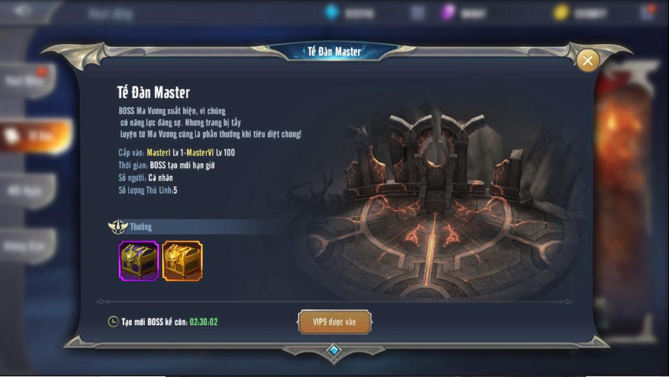 - Bản đồ Tế đàn Master có 5 Boss chính, người chơi diệt Boss sẽ nhận được trang bị cá nhân, trang bị thú cưỡi cùng nhiều vật phẩm khác.