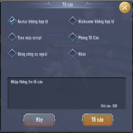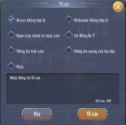- Lưu ý: Sau khi chọn lý do, người chơi cần nhập đầy đủ thông tin tố cáo.