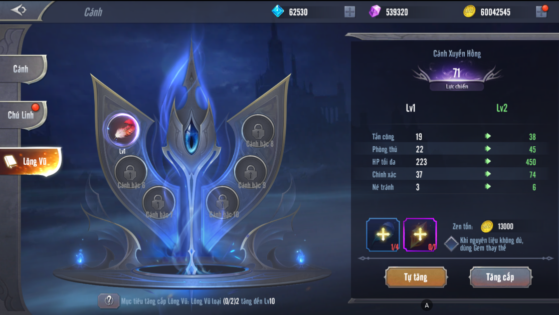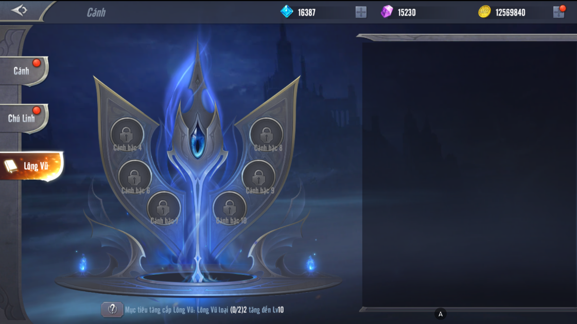 - Khi người chơi nâng cấp cánh đến những bậc nhất định, ô tính năng sẽ lần lượt mở tương ứng. Dùng Blue Feather và Lửa Andes để tăng cấp Lông Vũ.