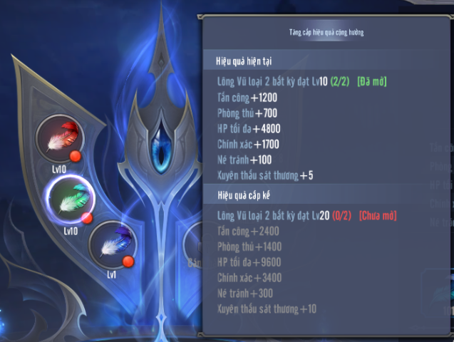 - Ngoài ra khi nâng cấp đủ theo yêu cầu Mục tiêu tăng cấp Lông Vũ, người chơi sẽ được kích hoạt Hiệu ứng cộng hưởng – gia tăng nhiều thuộc tính và lực chiến.