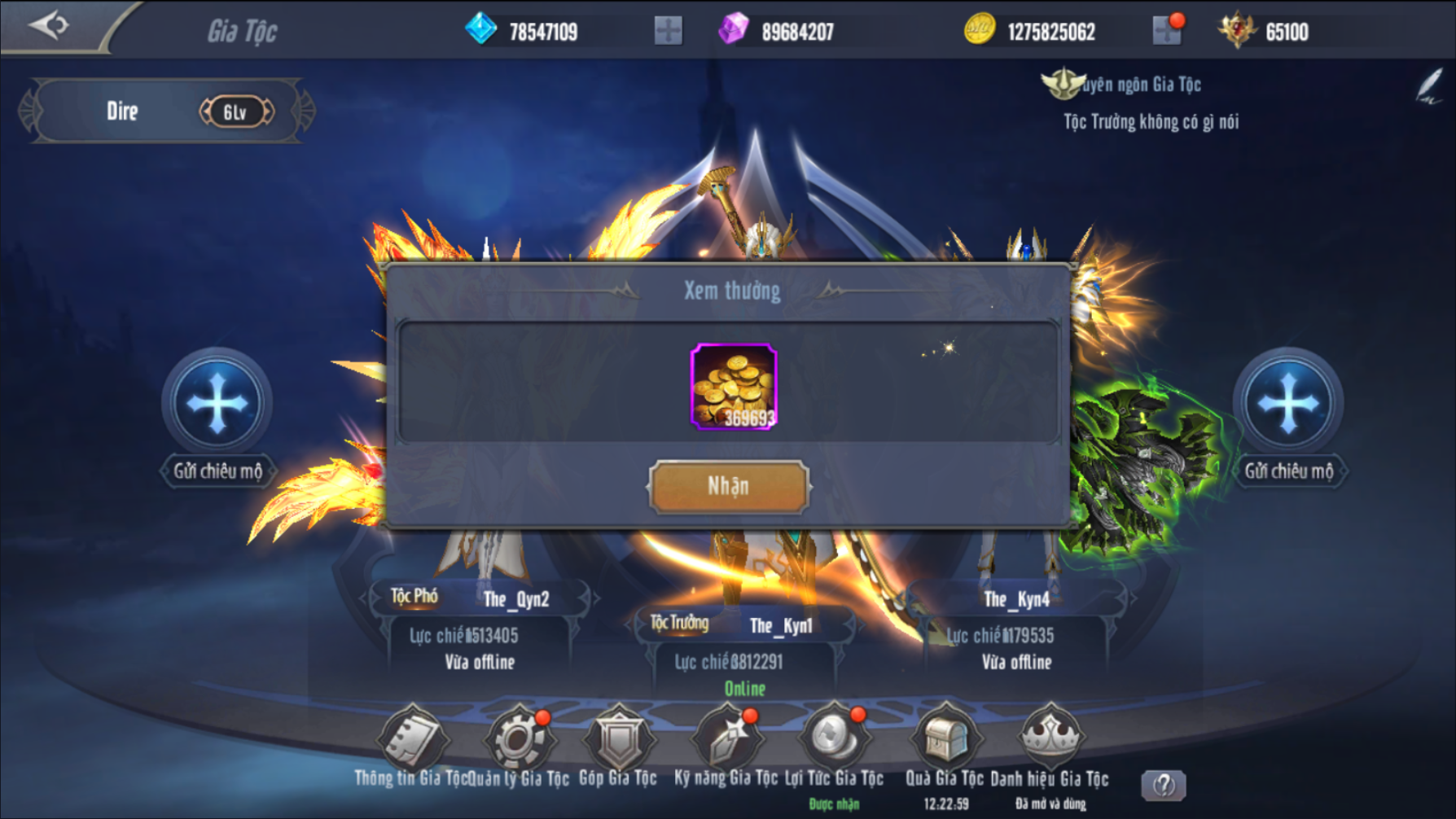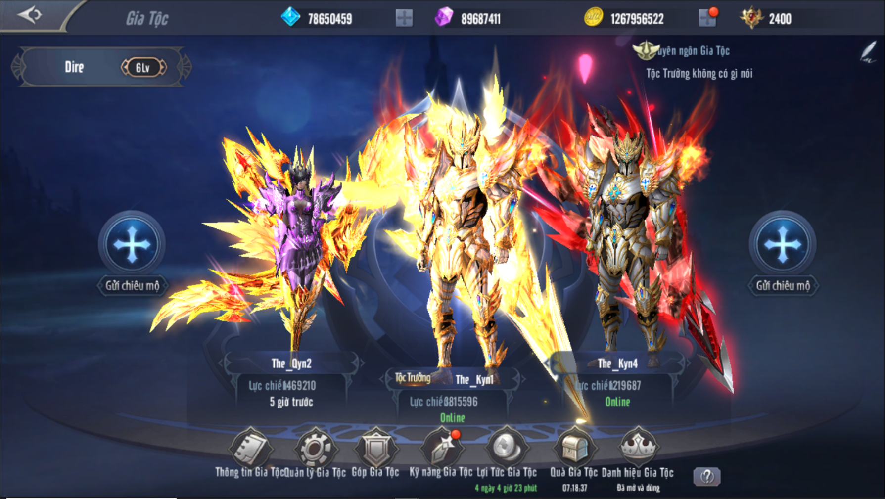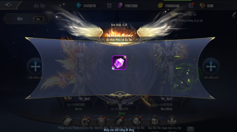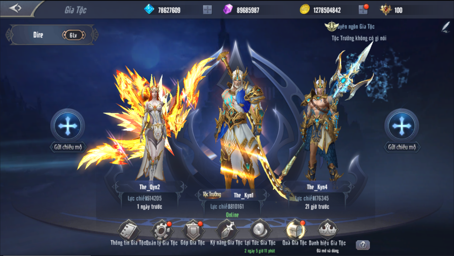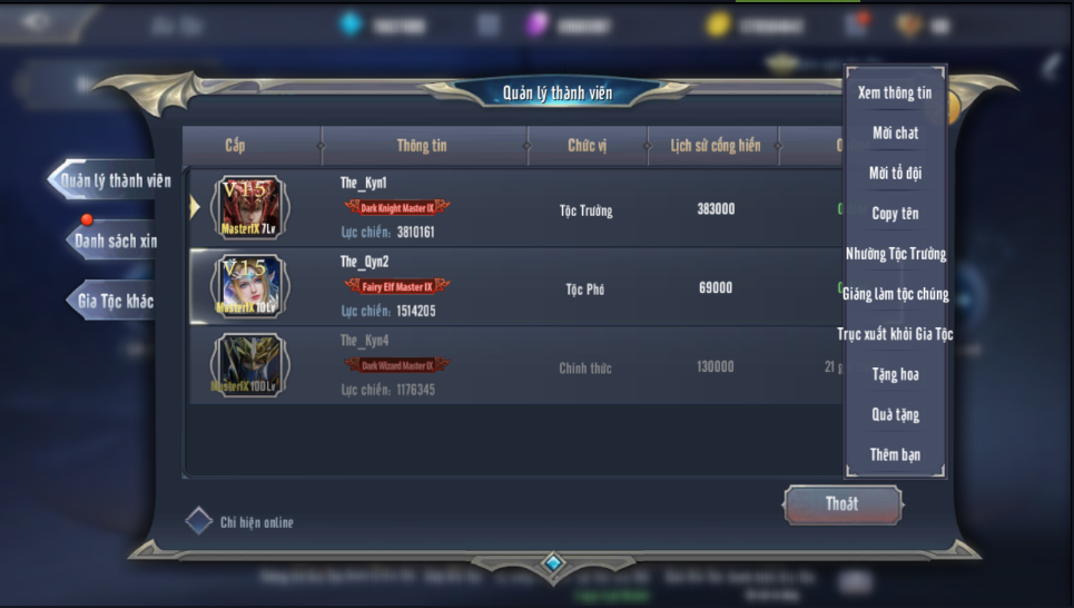Quản lý thành viên: nơi Tộc Trưởng có thể xem các thông tin của thành viên trong Gia Tộc, cũng như các lựa chọn để tương tác với thành viên (quà tặng, thăng chức, trục xuất khỏi Gia Tộc,…)