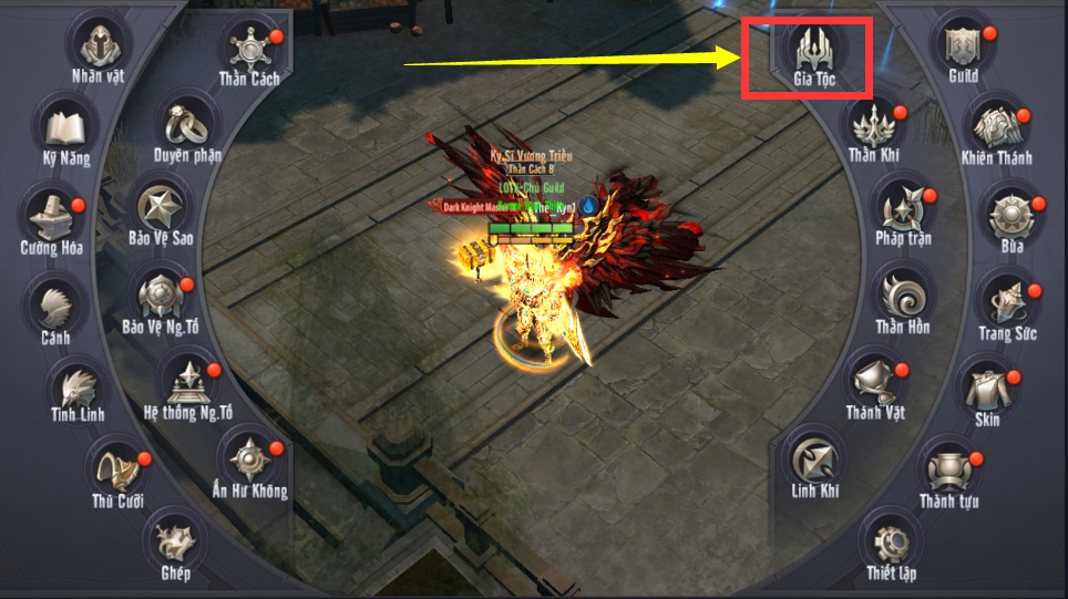 Để truy cập vào chức năng Gia Tộc, người chơi bấm vào mục Gia Tộc trong menu nhân vật.