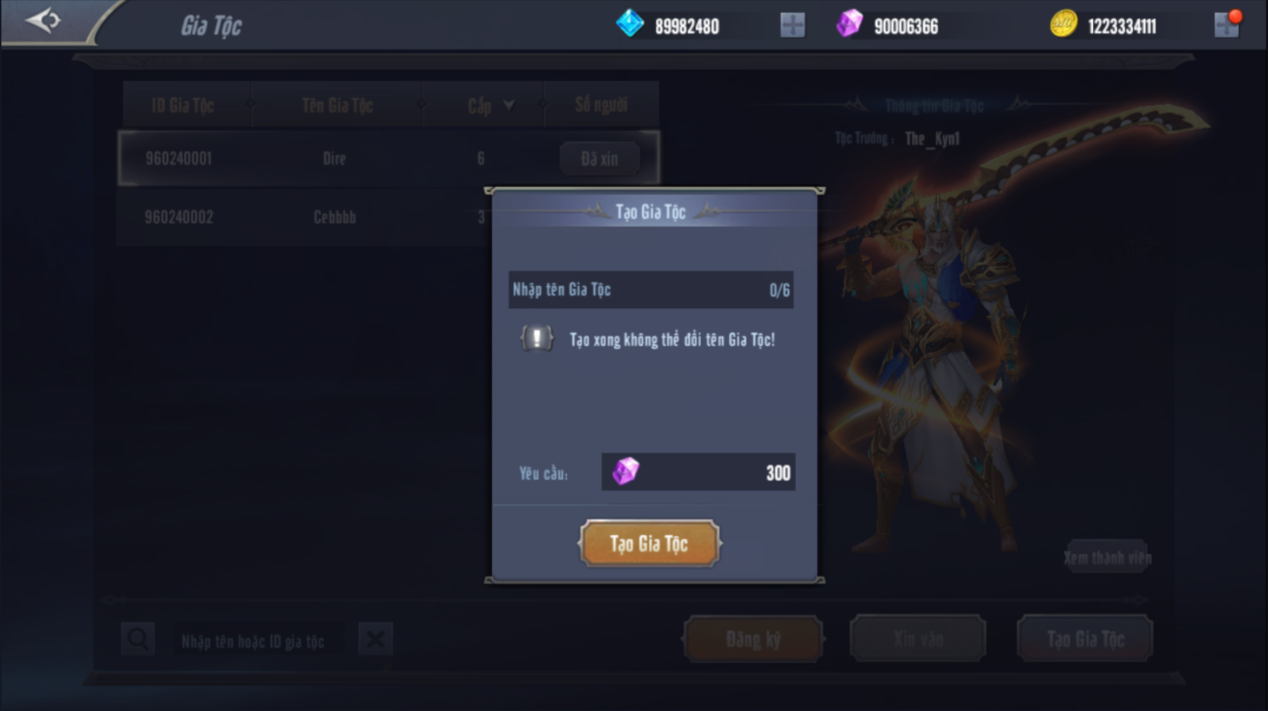 Điền đầy đủ thông tin và đọc kỹ các lưu ý, phí tạo gia tộc sẽ là 300 Gem Khóa, khi đã hoàn tất nhấp vào nút Tạo Gia Tộc. Người tạo gia tộc mặc định sẽ trở thành Tộc Trưởng.