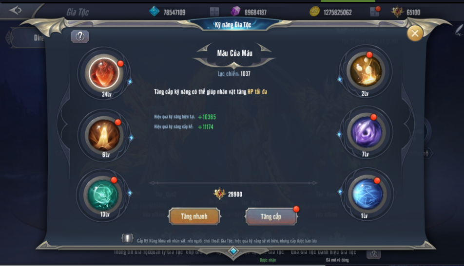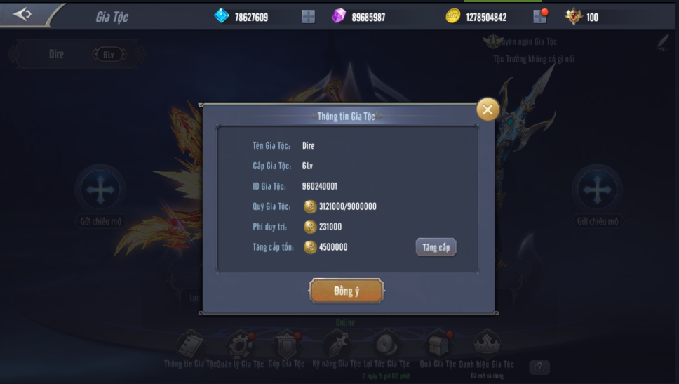 - Tăng Cấp Tốn (ở phần này nếu là Tộc Trưởng sẽ xuất hiện thêm tùy chọn Tăng Cấp cho Gia Tộc, điều kiện để tăng cấp là số tiền quỹ đủ để chi trả cho phí Tăng cấp tốn)