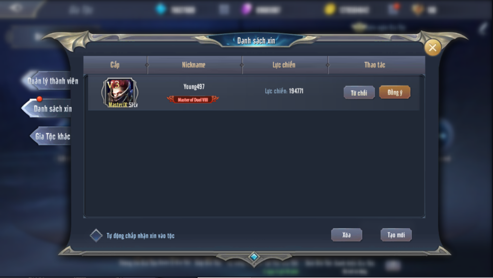 Hệ thống sẽ cập nhật người chơi vào danh sách Xin vào của gia tộc đó và chờ Tộc Trưởng đồng ý cho phép gia nhập.