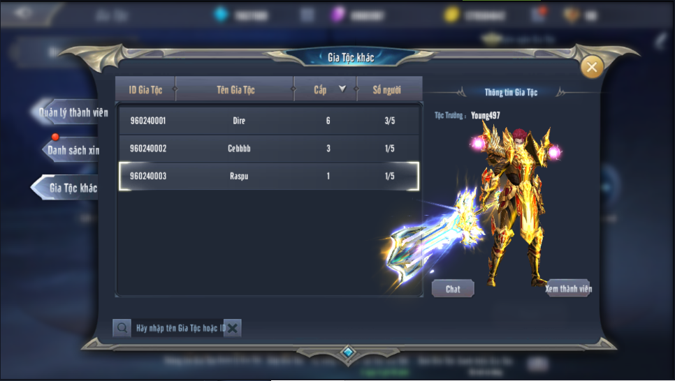 Gia tộc khác: mục này cho phép người chơi xem thông tin và thông tin các thành viên của Gia Tộc khác.