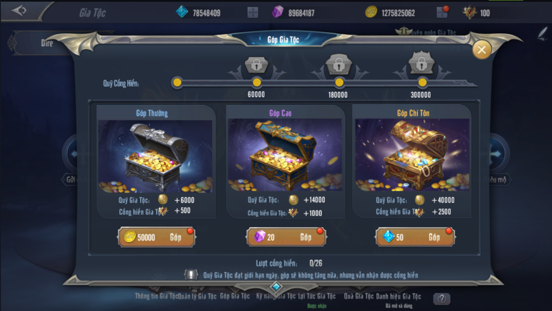 Lưu ý: khi Quỹ Gia Tộc đạt giới hạn ngày, quỹ sẽ không tăng lên nữa, tuy nhiên khi cống hiến người chơi sẽ vẫn nhận được điểm Cống Hiến Gia Tộc.