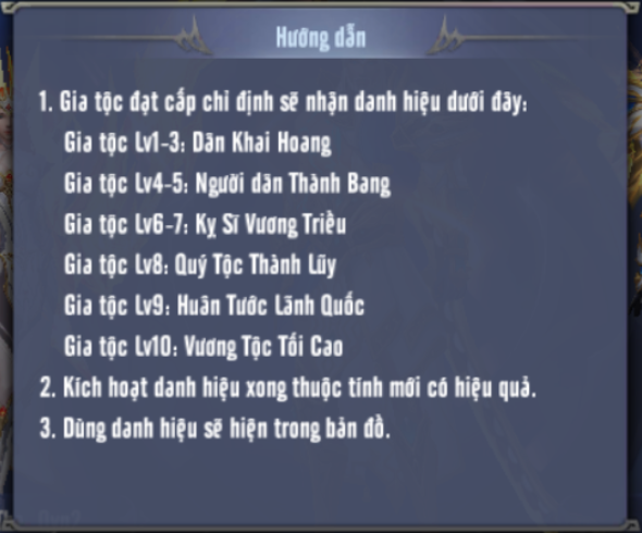 Khi gia tộc đạt cấp nhất định sẽ mở danh hiệu cho tất cả các thành viên gia tộc đó.