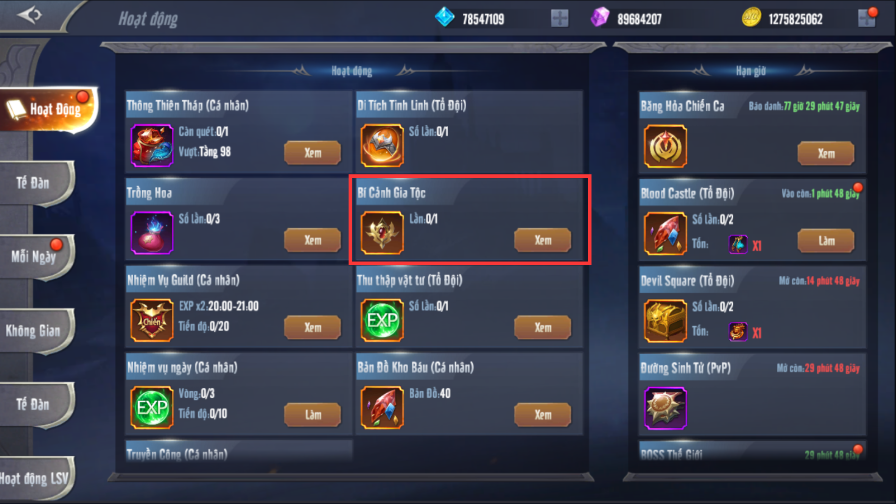 Để vào Bí Cảnh Gia Tộc, bấm vào Bí Cảnh Gia Tộc trong menu Hoạt Động ở khu vực bản đồ.