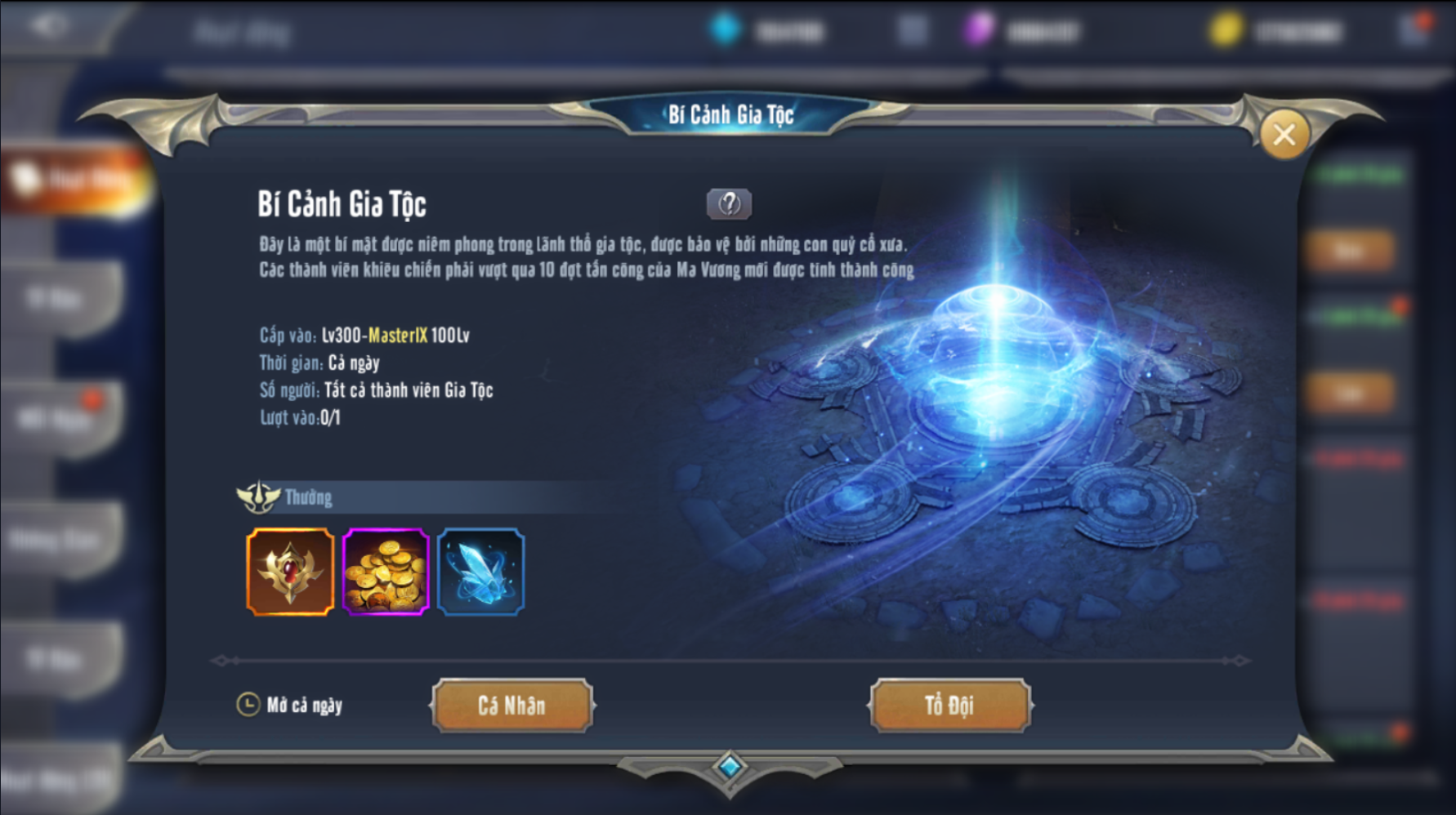 Đối với Cá Nhân, người chơi chỉ cần bấm vào mục Cá Nhân, lập tức được di chuyển tới Bí Cảnh.