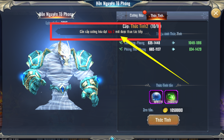 - Cấp Thức Tỉnh phải phụ thuộc vào Cấp Cường Hóa, không thể lớn hơn Cấp Cường Hóa.
