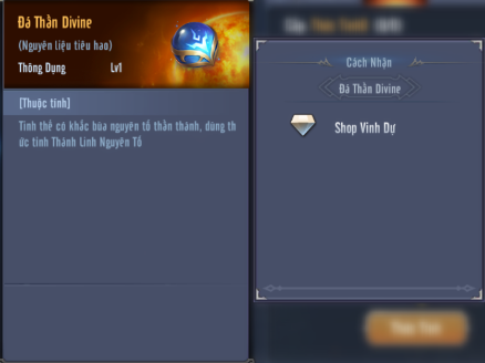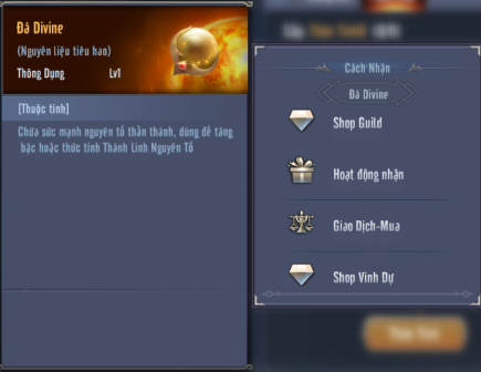 Đá Divine, có thể sở hữu vật phẩm thông qua Shop Guild, Giao Dịch – Mua, Shop vinh dự, hoặc các sự kiện…
