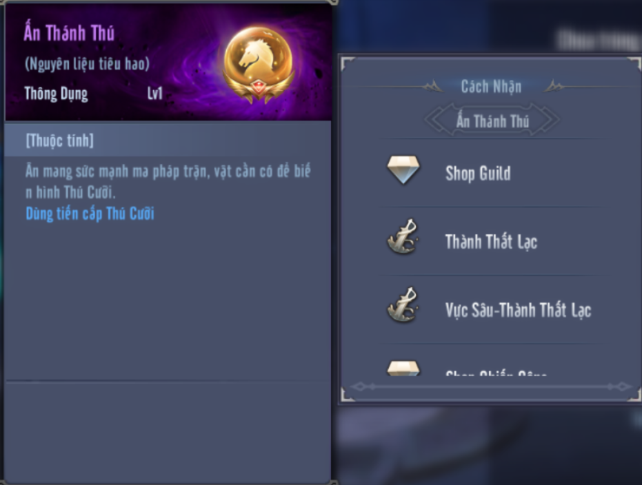 Ấn Thánh Thú: Có thể sở hữu thông qua Shop Guild, Thành Thất Lạc, Vực Sâu – Thành Thất Lạc và Shop Chiến Công.