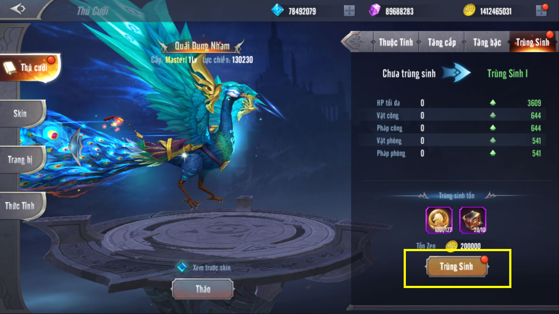 Để truy cập vào chức năng Trùng Sinh, bấm chọn Trùng Sinh ở mục chức năng Thú Cưỡi.
